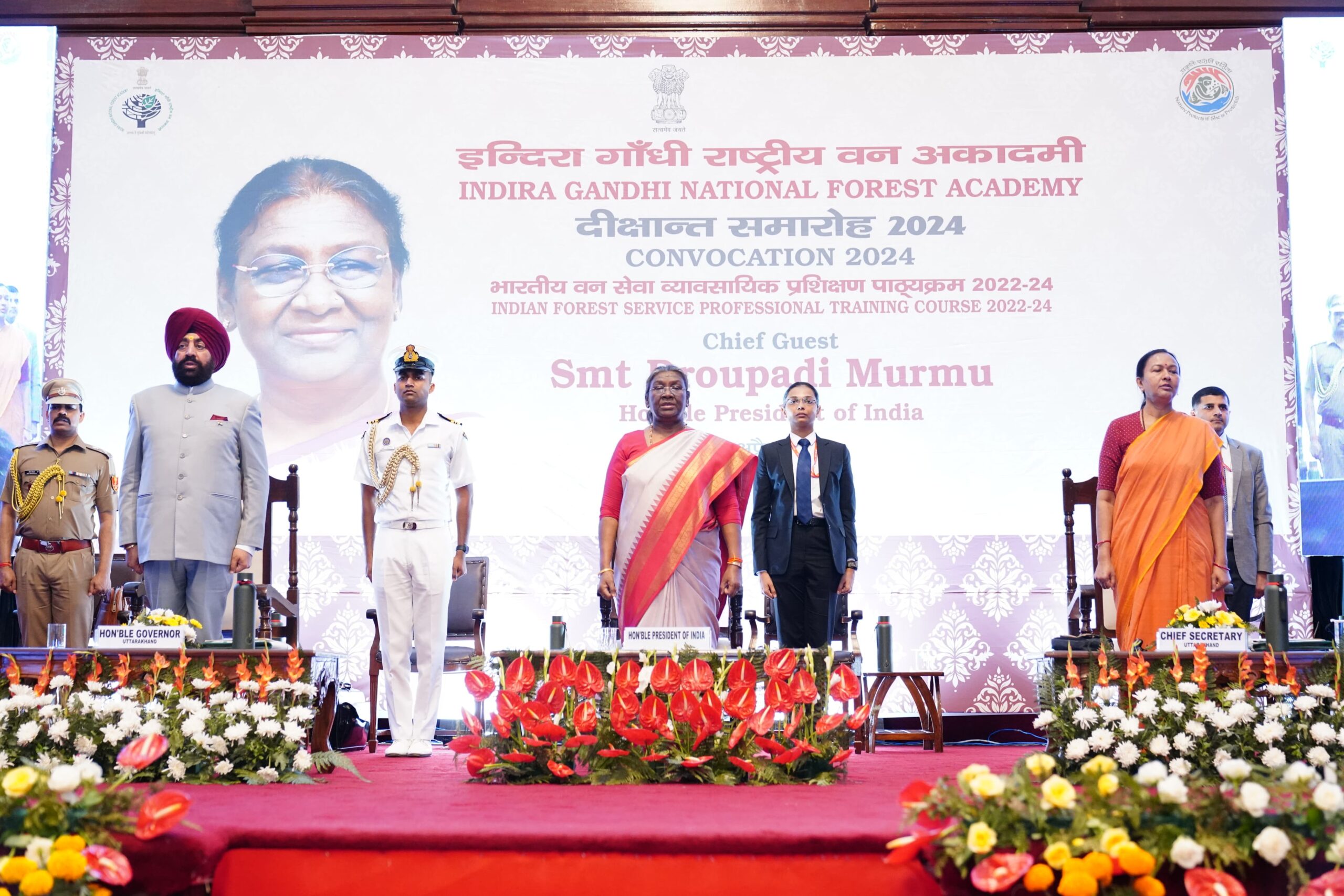 इस अवसर पर राष्ट्रपति ने परिवीक्षार्थियों को प्रमाण पत्र और पदक प्रदान किये।राष्ट्रपति श्रीमती द्रौपदी मुर्मु ने भारतीय वन सेवा के 2022 बैच के सभी प्रशिक्षु अधिकारियों को बधाई देते हुए कहा कि इस बैच में 10 महिला अधिकारी हैं। उन्होंने कहा कि महिलाएं समाज के प्रगतिशील बदलाव की प्रतीक हैं। राष्ट्रीय वन अकादमी की पर्यावरण के क्षेत्र में अत्यंत महत्वपूर्ण भूमिका रही है। भारतीय वन सेवा के अधिकारियों पर जंगलों के संरक्षण, संवर्धन एवं पोषण की जिम्मेदारी है। उन्होंने आशा व्यक्त की कि ये अधिकारी अपने इस अप्रतिम दायित्व के प्रति सजग और सचेत होंगे एवं पूर्ण निष्ठा से अपने उत्तरदायित्वों का निर्वहन करेंगे। उन्होंने कहा की हमारी प्राथमिकताएं मानव केंद्रित होने के साथ-साथ प्रकृति केंद्रित भी होनी चाहिए। राष्ट्रपति ने कहा कि पृथ्वी की जैव-विविधता एवं प्राकृतिक सुंदरता का संरक्षण अत्यंत महत्वपूर्ण कार्य है, जिसे हमें अति शीघ्र करना है। वन एवं वन्य जीवों के संरक्षण और संवर्धन के जरिए मानव जीवन को संकट से बचाया जा सकता है। भारतीय वन सेवा के श्री पी. श्रीनिवास, श्री संजय कुमार सिंह, श्री एस. मणिकन्दन जैसे अधिकारियों ने ड्यूटी के दौरान अपने कर्तव्यों का निर्वहन करते हुए प्राण न्योछावर किए हैं। देश को भारतीय वन सेवा ने बहुत अधिकारी दिये हैं, जिन्होंने पर्यावरण के लिए अतुलनीय कार्य किए हैं। उनकी चर्चा बहुत सम्मान से की जाती है। उन सभी को आप अपना रोल मॉडल बनाएं एवं उनके दिखाए आदर्शों पर आगे बढ़ें। राष्ट्रपति ने भारतीय वन अकादमी के विशेषज्ञों से अपेक्षा की कि जलवायु की आपातकालीन स्थिति को देखते हुए प्रशिक्षार्थियों के पाठ्यक्रम में यथोचित संशोधन करने पर विचार करें। विश्व के कई भागों में वन संसाधनों की क्षति बहुत तेजी से हुई है। विज्ञान और प्रौद्योगिकी की मदद से हम क्षति-पूर्ति तेज गति से कर सकते हैं। विभिन्न विकल्पों का आकलन करके भारत की भौगोलिक परिस्थितियों के अनुरूप समाधान विकसित करने की आवश्यकता है। राष्ट्रपति ने कहा कि विकास-रथ के दो पहिये होते हैं – परंपरा और आधुनिकता। आज मानव समाज पर्यावरण संबंधी कई समस्याओं का दंश झेल रहा है। इसके प्रमुख कारणों में विशेष प्रकार की आधुनिकता है, जिसके मूल में प्रकृति का शोषण है। इस प्रक्रिया में पारंपरिक ज्ञान को उपेक्षित किया जाता है। जनजातीय समाज ने प्रकृति के शाश्वत नियमों को अपने जीवन का आधार बनाया है। जनजातीय जीवन शैली मुख्यतः प्रकृति पर आधारित होती है। इस समाज के लोग प्रकृति का संरक्षण भी करते हैं। यह अत्यंत महत्वपूर्ण है कि सदियों से जनजातीय समाज द्वारा संचित ज्ञान के महत्व को समझा जाए और पर्यावरण को बेहतर बनाने के लिए उसका उपय